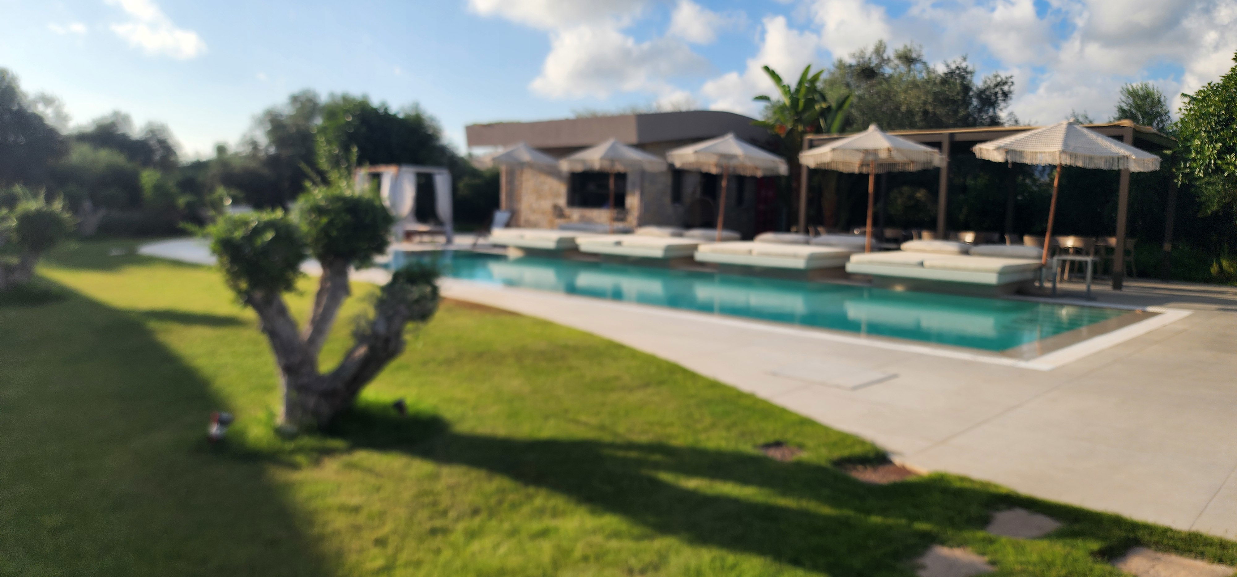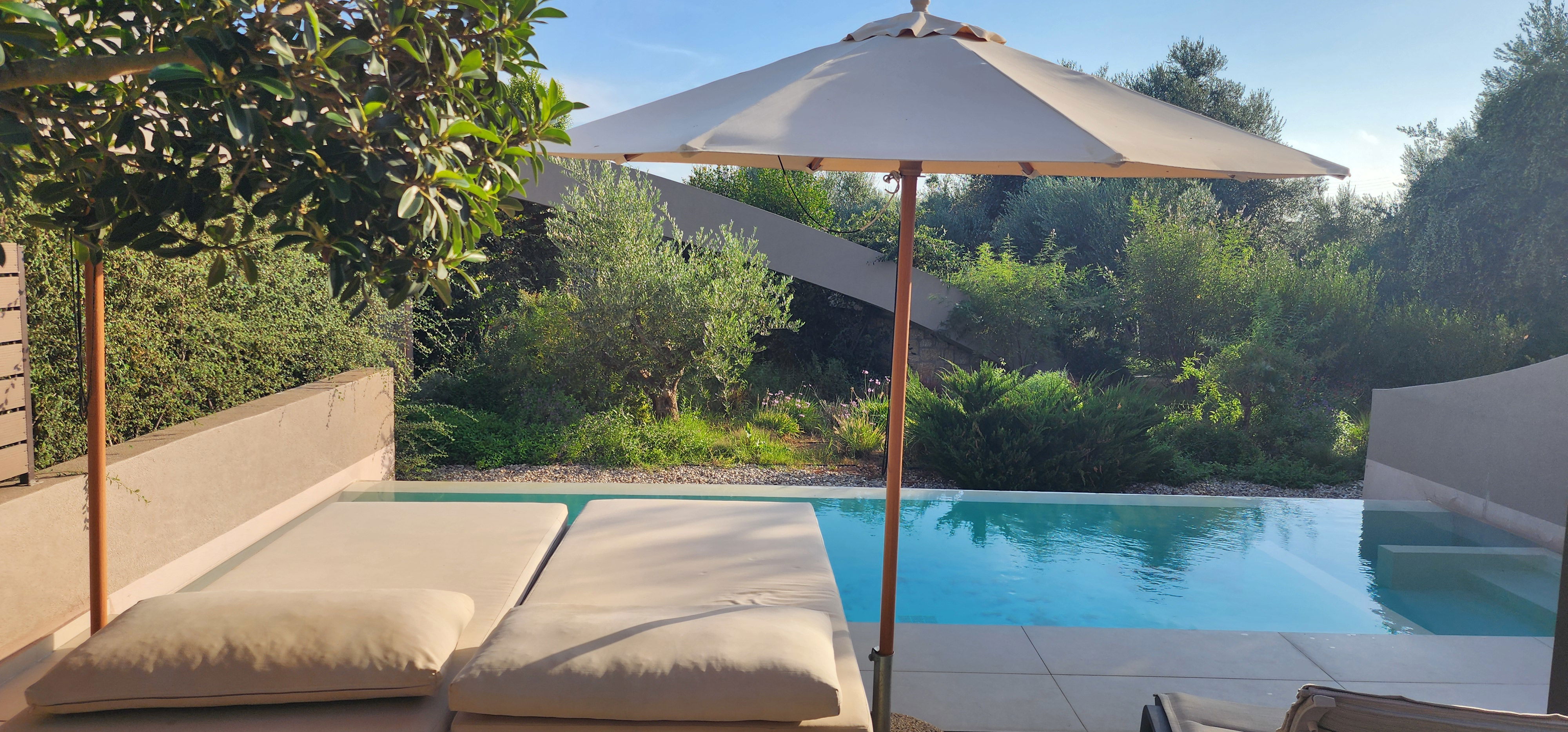 דירה חדשה ונקייה עם מטבחון, חדר שינה נפרד מהסלון ובריכה פרטית. יש גם בריכה מרכזית ומיני בר.