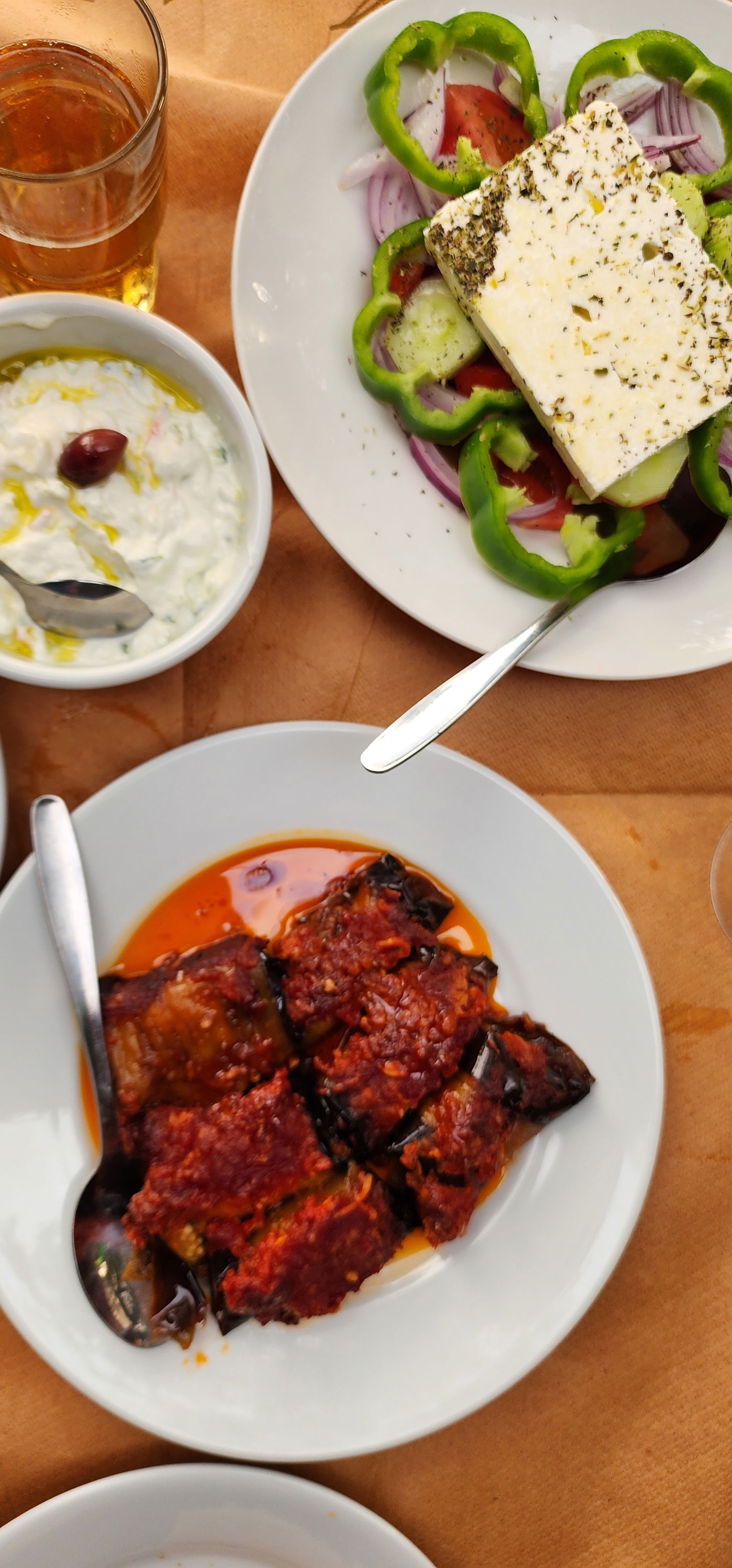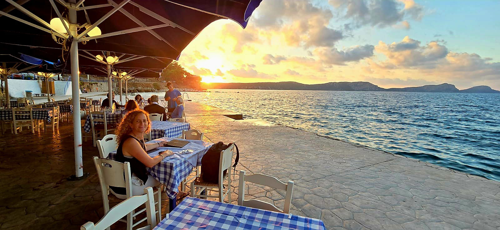בטיילת שלאורך החוףכ מובן שלקראת השקיעה התיישבנו לארוחת ערב עם התפריט הקבוע: סלט יווני, צזיקי, מנת חצילים, סופלאקי ובירה