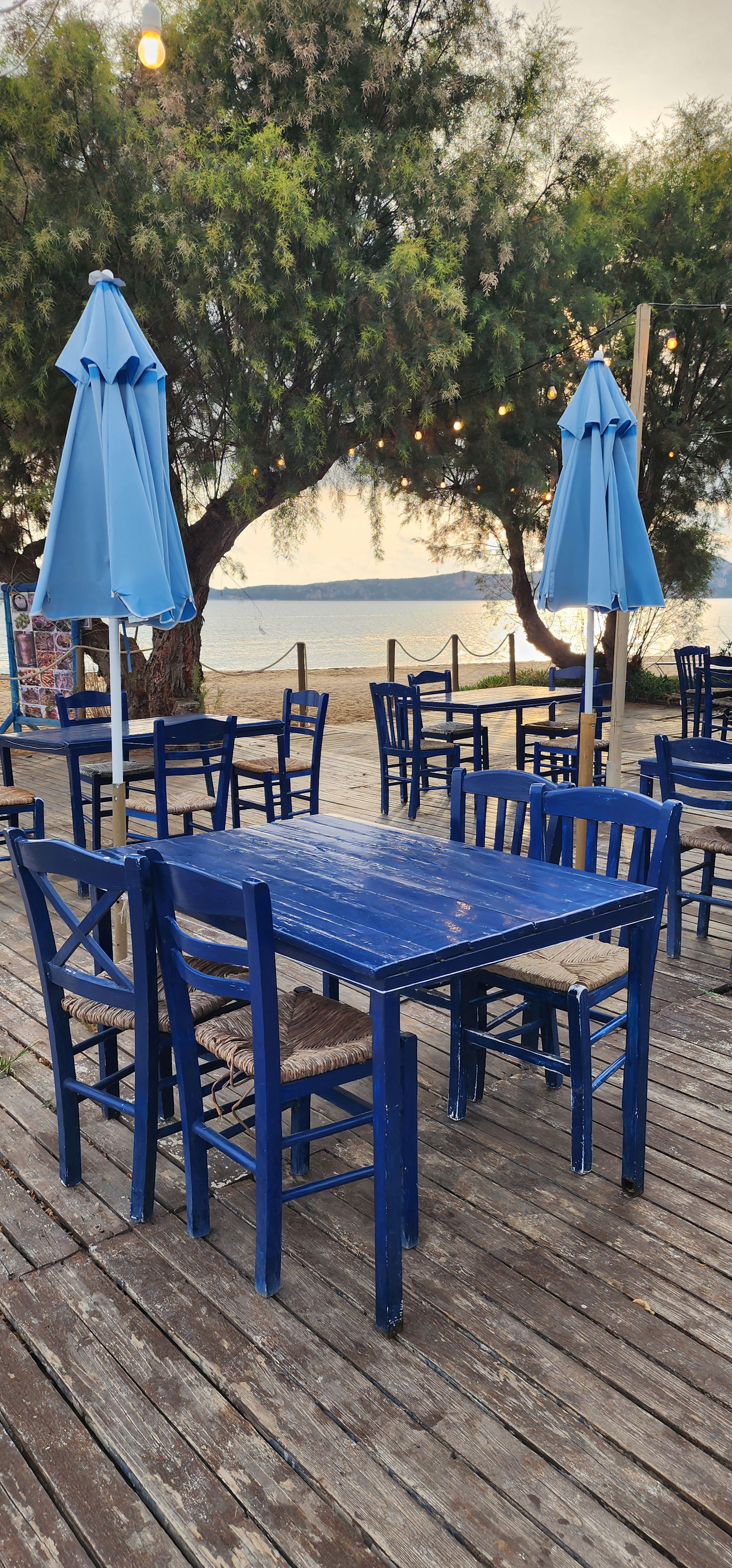מפות משובצות כחול לבן, שקיעה, צזיקי, סלט יווני, קלמרי, בירה מקומית..מבסוטים.
