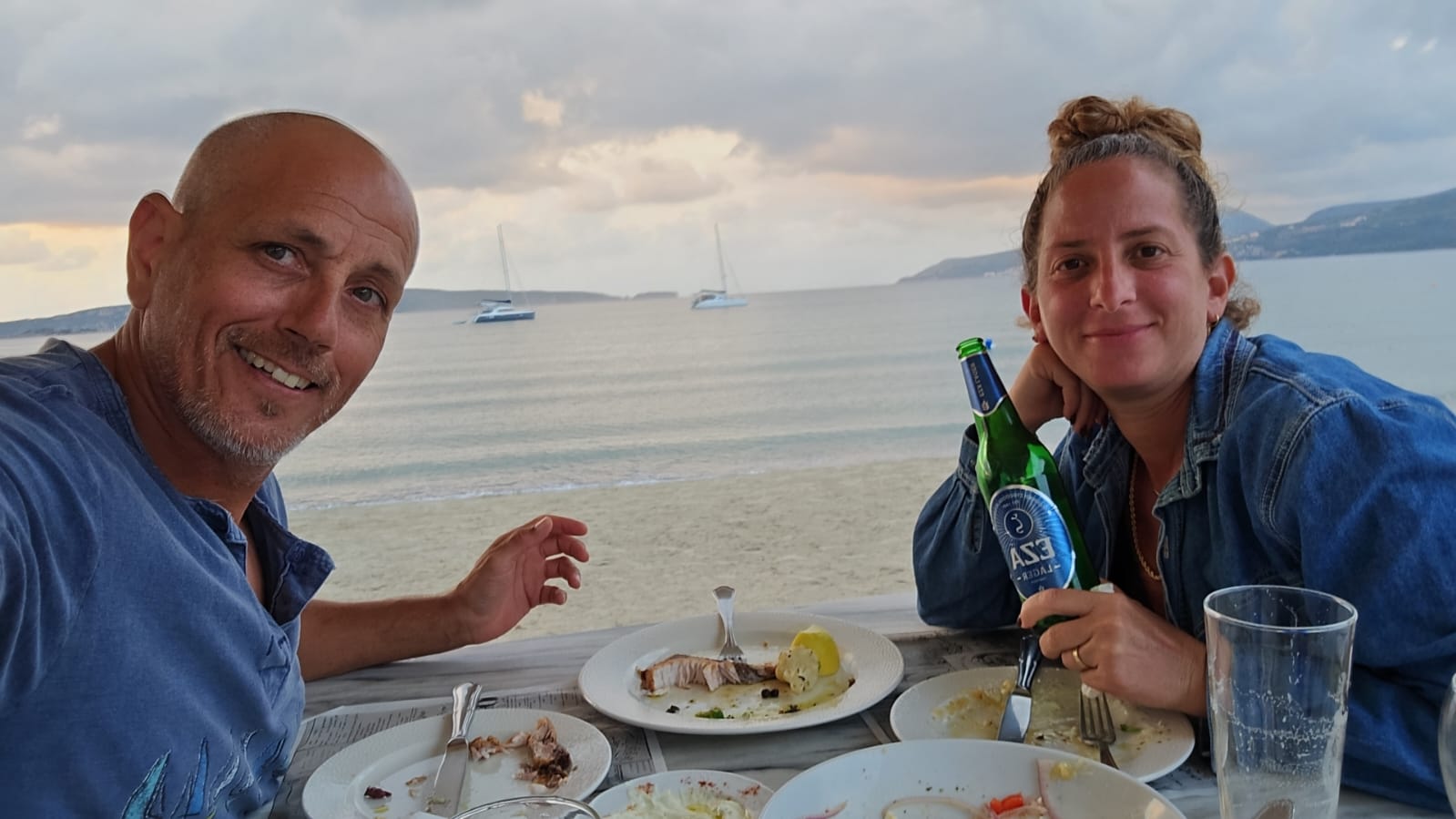 התיישבנו לארוחת ערב במסעדה נהדרת בשם Notre Maison. הכל היה כמובן טעים: סלט יווני, צזיקי, סלט חצילים דג מקומי שהוציאו לפני כמה שעות מהים לצד ירקות צלויים ותפוחי אדמה בטאבון, בירה מקומית ו...