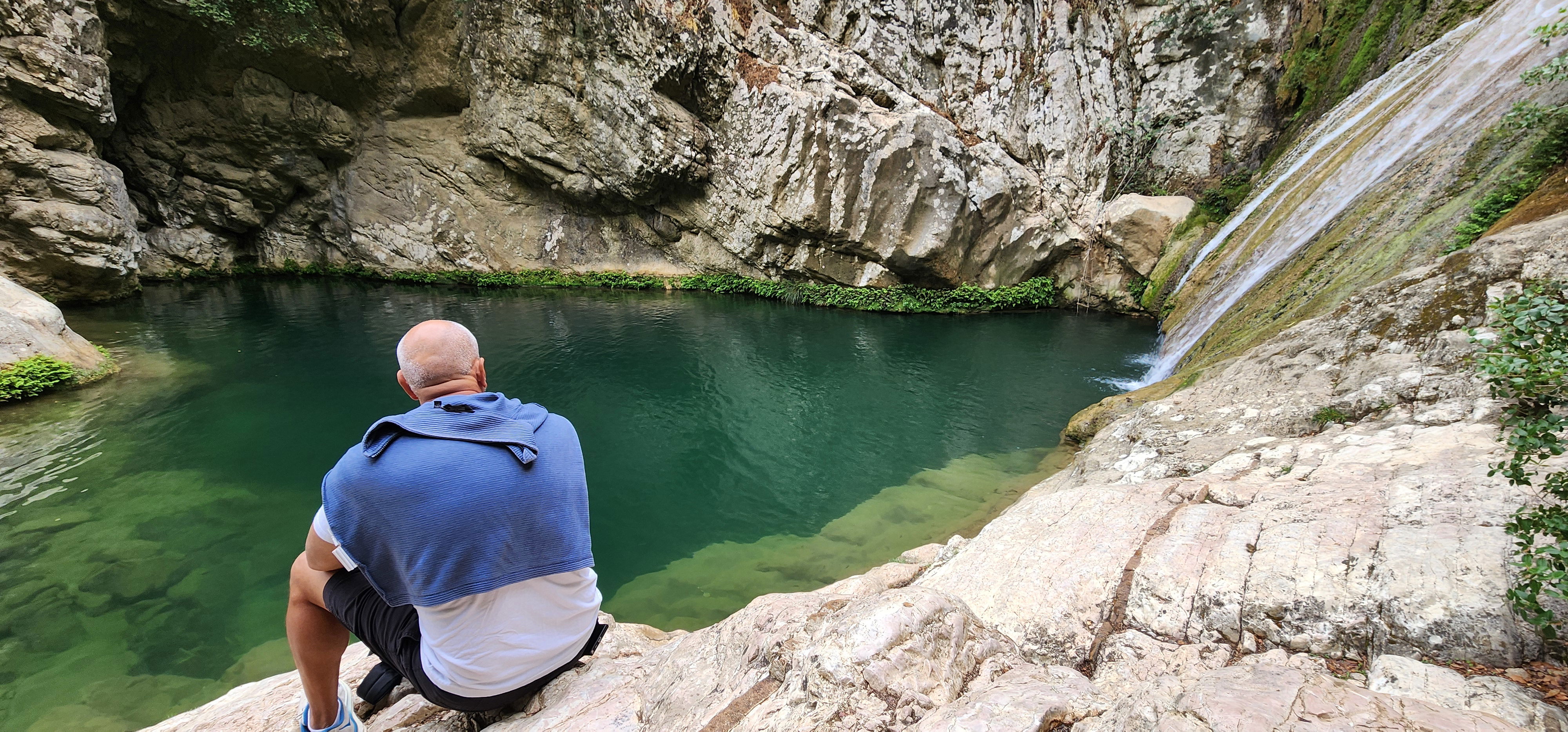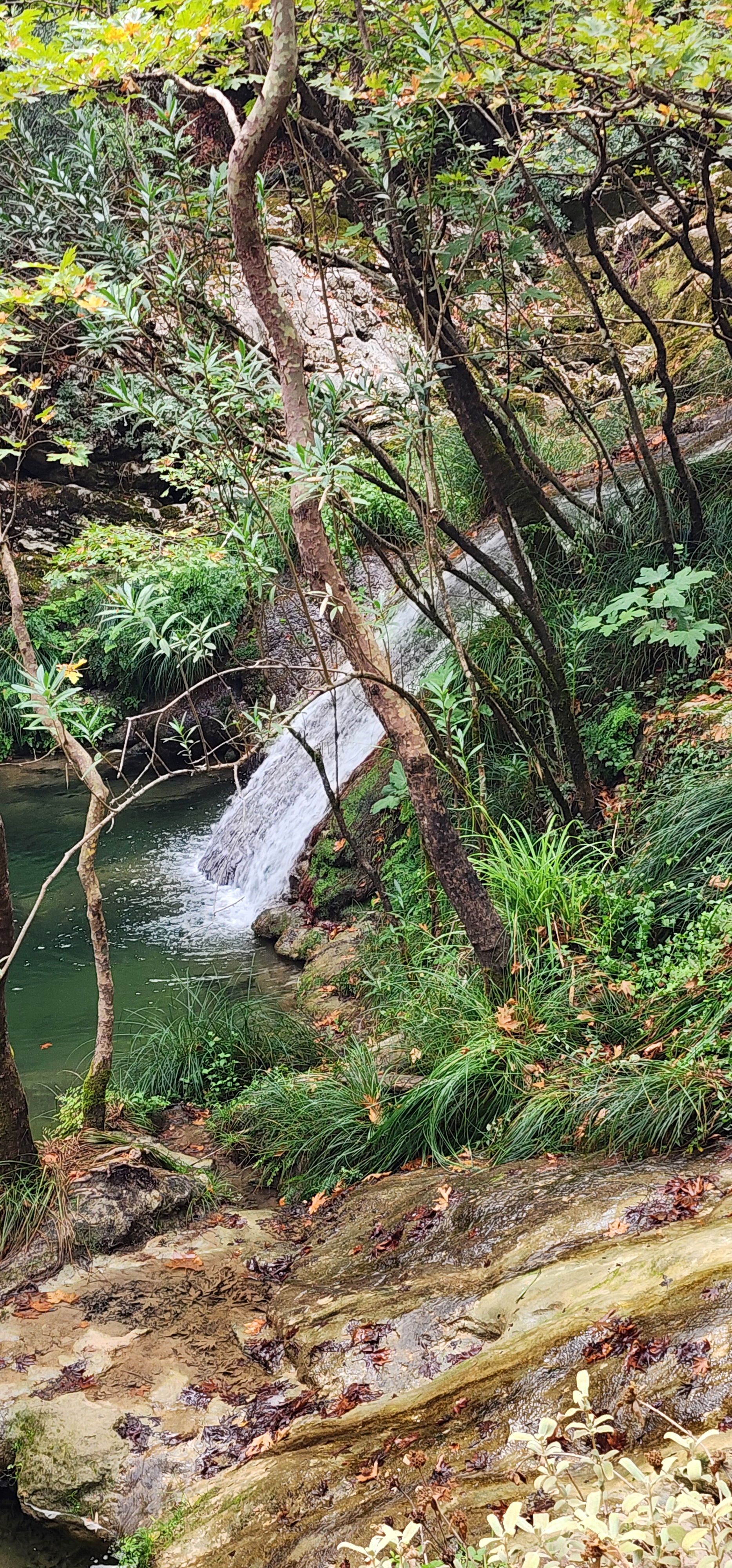 המפלים עצמם יפייפים ומתגמלים, לא היו המון מטיילים ...הלכנו לאורך המפלים (ימינה למעלה מסוף הירידה) עד שהגענו למפל מרשים עם בריכה ירוקה וקפואה - היו מטיילים אמיצים שנכנסו לשחייה. הפעם אנחנו ויתרנו. יש אפשרות להמשיך במסלול עולה עם יתדות גם מעבר למפל בו היינו, אבל לאור מזג האוויר המטפטף והחלקלק החלטנו להסתפק ולא להמשיך. החלטה נכונה בדיאבד, שכן שוב התחיל גשם ועד שהגענו למעלה לחניה הספקנו להירטב. אז עצרנו לקפה ועוגה מול הנוף ואחרי שנרגענו נסענו הלאה לכיוון המלון שלנו בקלמטה.